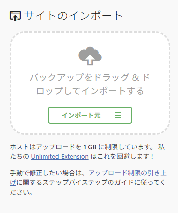 300M以上とかのバックアップデータは持っていないので、試したことはないが、512M以上はアップロードできるか怪しい。1024MとかにするとAll in one WP Mifration and Backup上では図のように、「ホストはアップロードを1Gに制限しています。」という表示になるが、どこかでロリポップは512Mまでしかアップできないと見た気がするので、512Mを超えたらアップできないかもしれない。まあ、そんなに大容量のデータをエクスポートすることはないとは思うから、実験もできないし、できないときの回避方法も、超えたときに考えます。